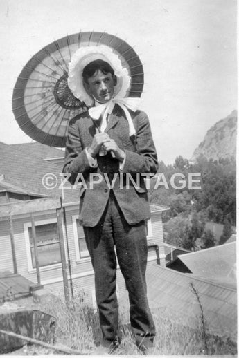 Vintage 1904 Funny Boy Dressed up In A Bonnet W/ Umbrella Photo #1867