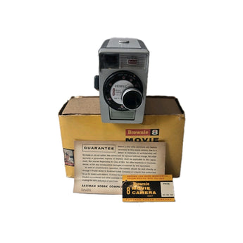 The Vintage 1950s KODAK BROWNIE 8mm Movie Camera is a classic piece of film history, featuring a f/2.7 lens that captures sharp and clear images. With its iconic brown color and non-reflex design, this camera by Kodak embodies the charm and nostalgia of old-school filmmaking. Made in the United States, the Brownie model is a true collector's item for those who appreciate vintage photography and movie cameras. Whether you're a film enthusiast or a collector of rare cameras, this KODAK BROWNIE 8mm Movie Camera is sure to be a standout piece in your collection.