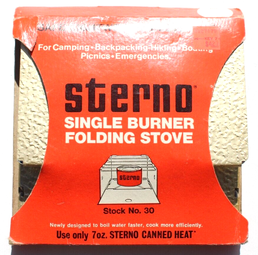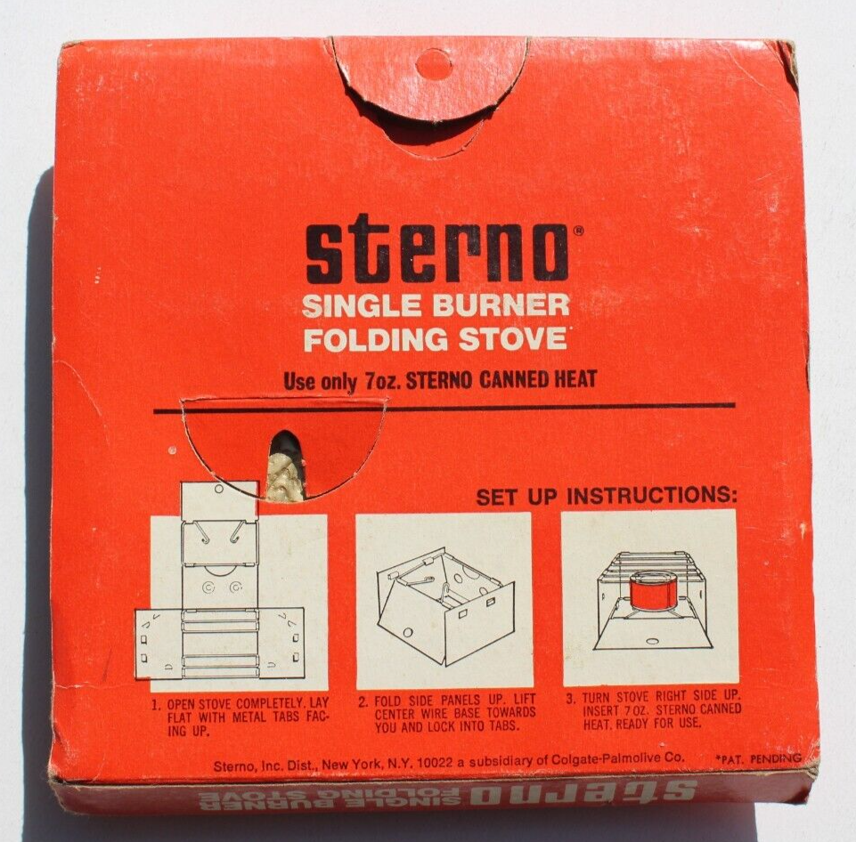 Vtg STERNO Single Burner Folding Stove Stainless Steel Gold Tone Camping 7oz NOS