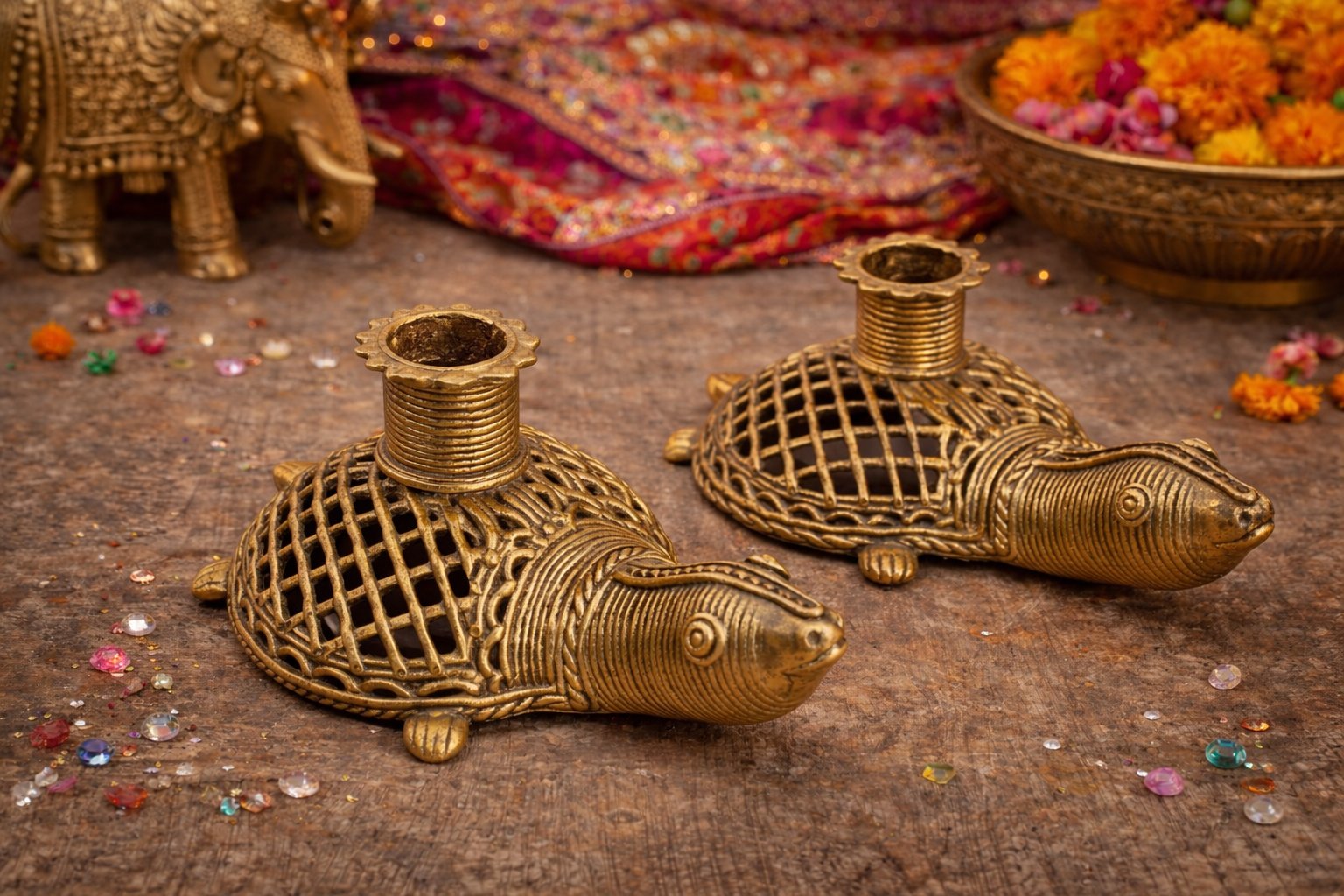 2 VTG Handcrafted Dhokra Metal Art Candle Stand W/ Netted Tortoise Figurine Base