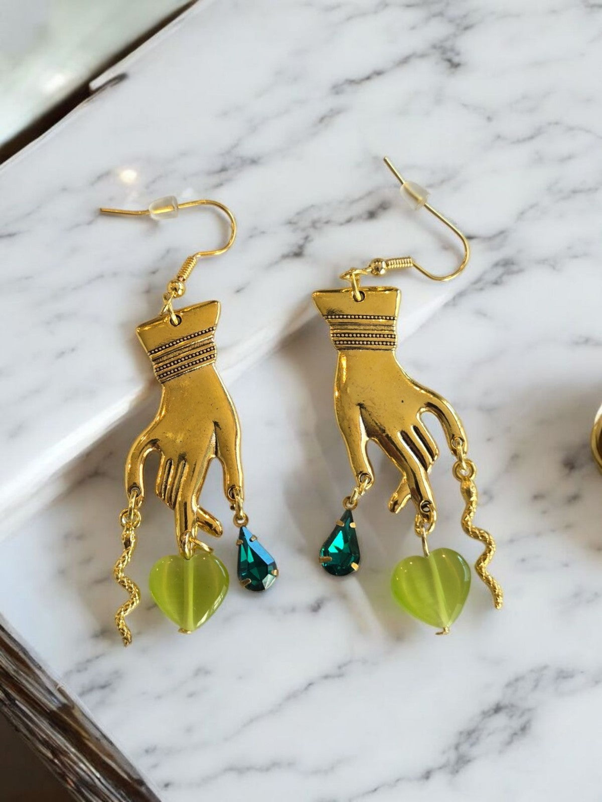 These New Gold Abstract Pop Art Hands With Snake Pierced Dangling Earrings are a unique and stylish addition to any woman's jewelry collection. The multicolor earrings feature a long shape with hands holding a snake, adding an artistic touch to the design. The earrings are made of metal with a gold base metal, making them a fashionable and eye-catching accessory for any outfit. The green main stone color adds a pop of color to the overall design, making these earrings a standout piece for those who appreciate art-inspired jewelry.