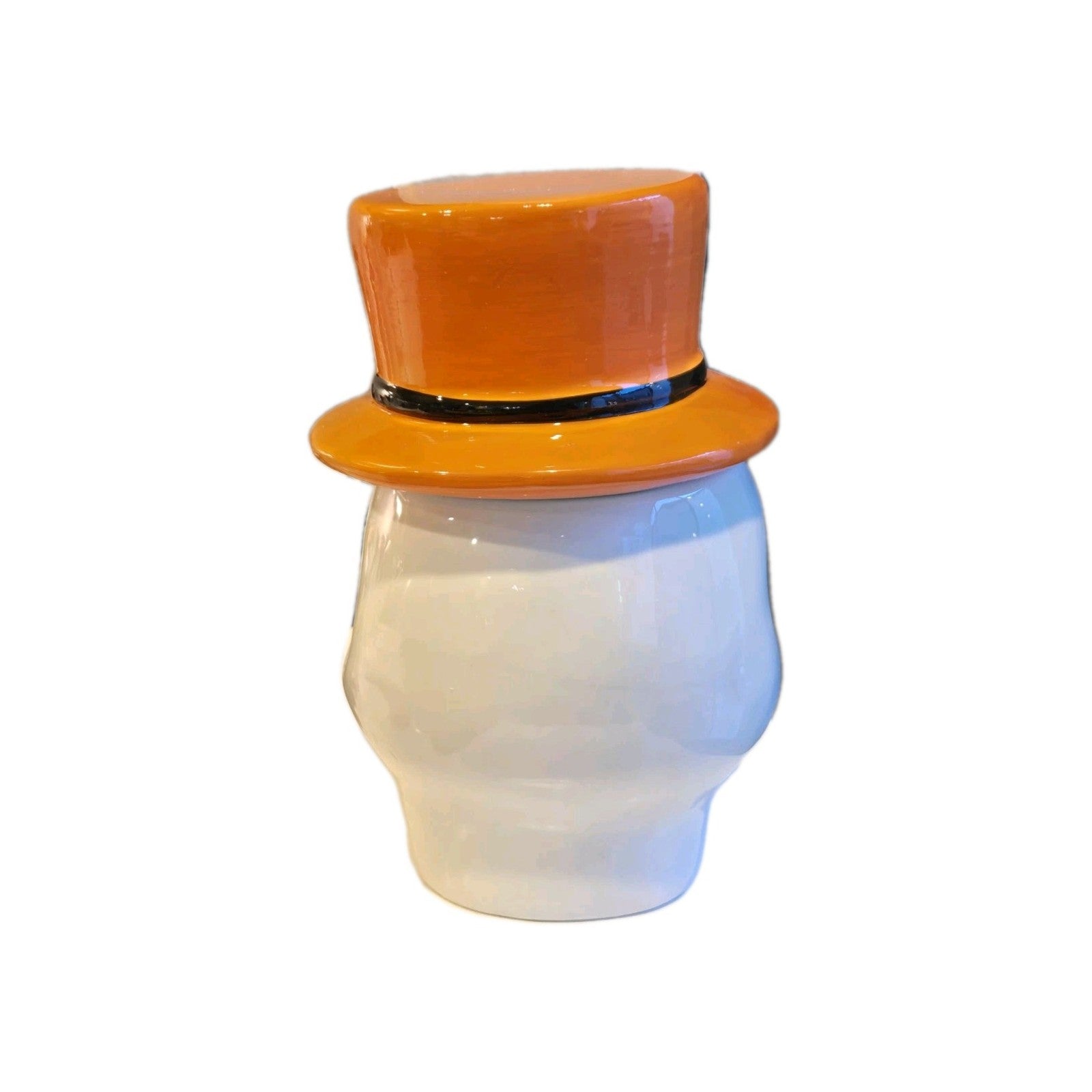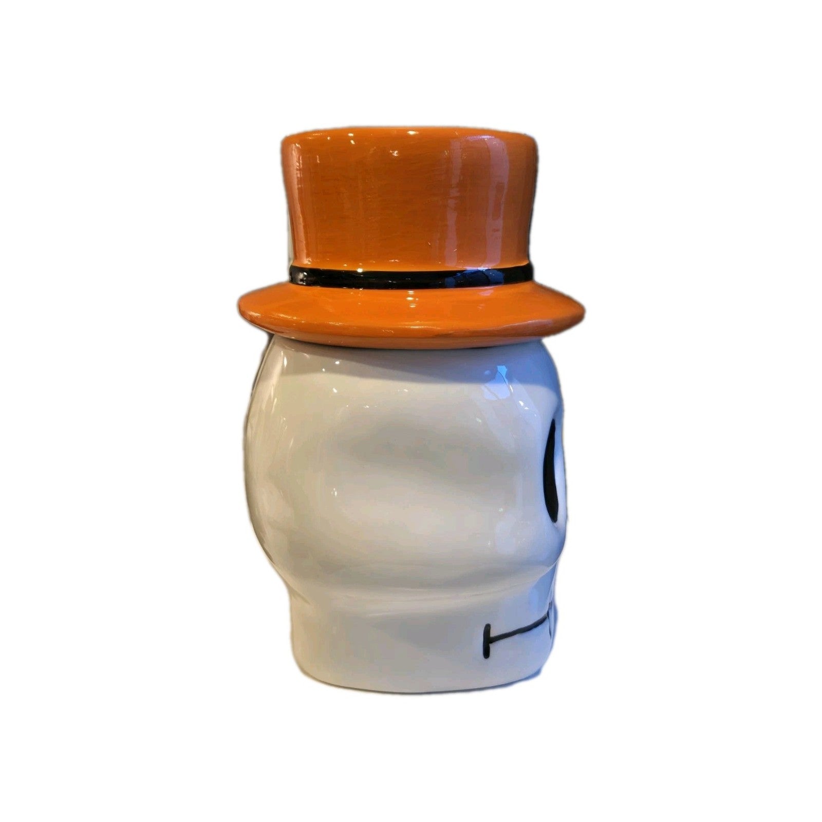 New Halloween Spooky Ceramic Skull W/ Orange Top Hat Cookie Jar Decorative