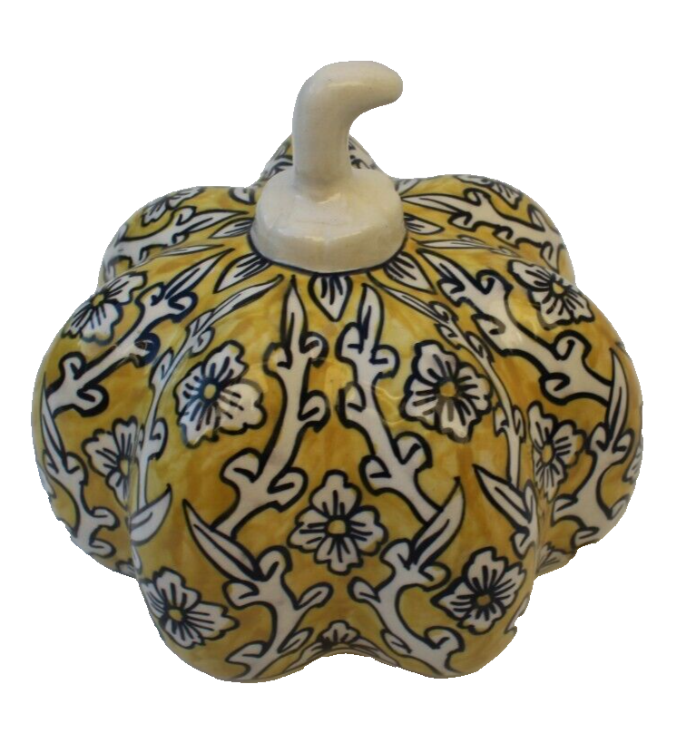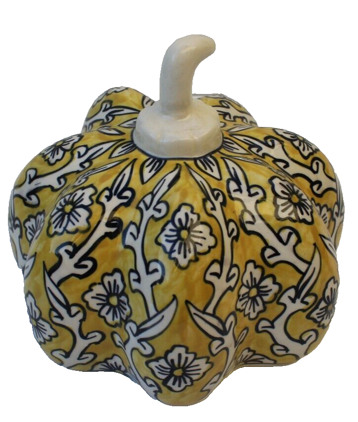 New Lrg Yellow Black Hand Painted Ceramic Pumpkin Floral Decorative Fall Decor