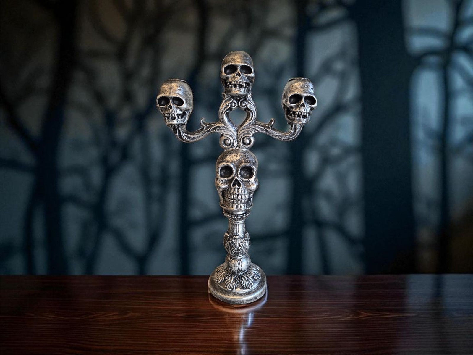 The product is a Martha Stewart Home Halloween Skull Candelabra, a silver 14-inch candle holder made of resin. Perfect for adding a spooky touch to your home decor, this candelabra features a skull theme, making it a unique and stylish addition to your Halloween decorations. The set includes a single candle holder, ideal for creating a warm and festive atmosphere during the Halloween season.