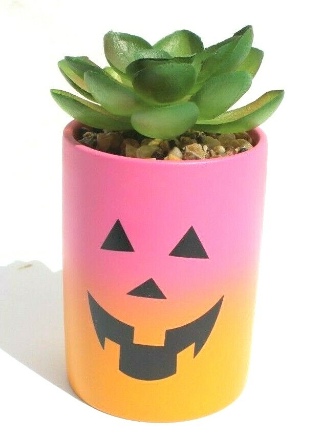 NEW Pink / Orange Happy Halloween Pumpkin Ceramic Planter Plot W/ Succulents