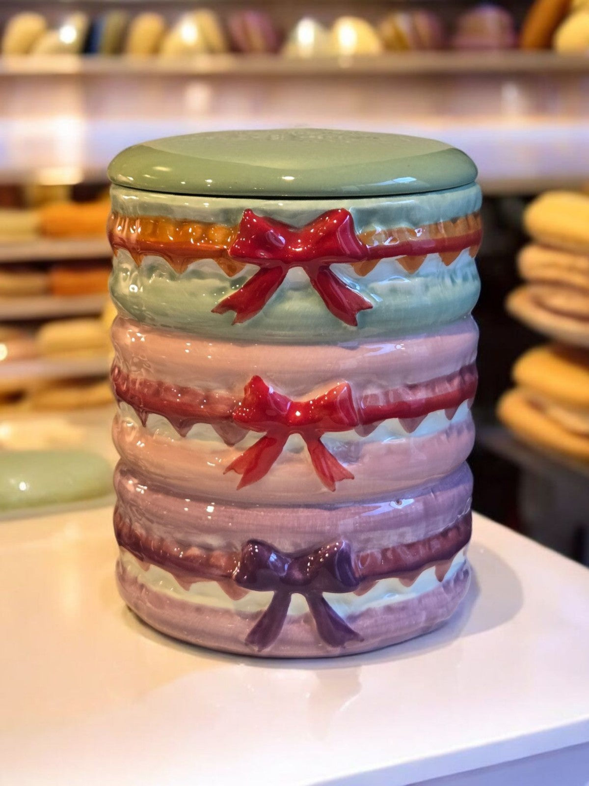 New Pastel Macaroon Cookie Ceramic Kitchen Bakery Cookie Jar W/ Lid Gift