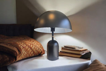 The product is a modern matte black dome table lamp made of metal in a minimalist design. It features a sleek corded light sensor, perfect for adding a contemporary touch to any room. The black metal finish and dome shape make it a stylish and versatile piece of decor suitable for various home and garden settings.