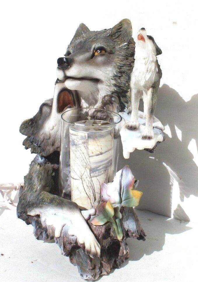 Vintage HOWLING WOLFPACK RESIN FIGURINE WOLF WOLVES Spinning Lamp NOS