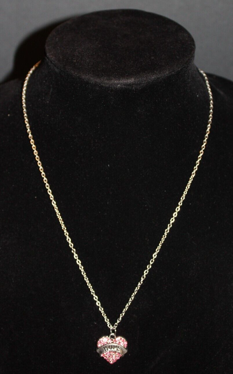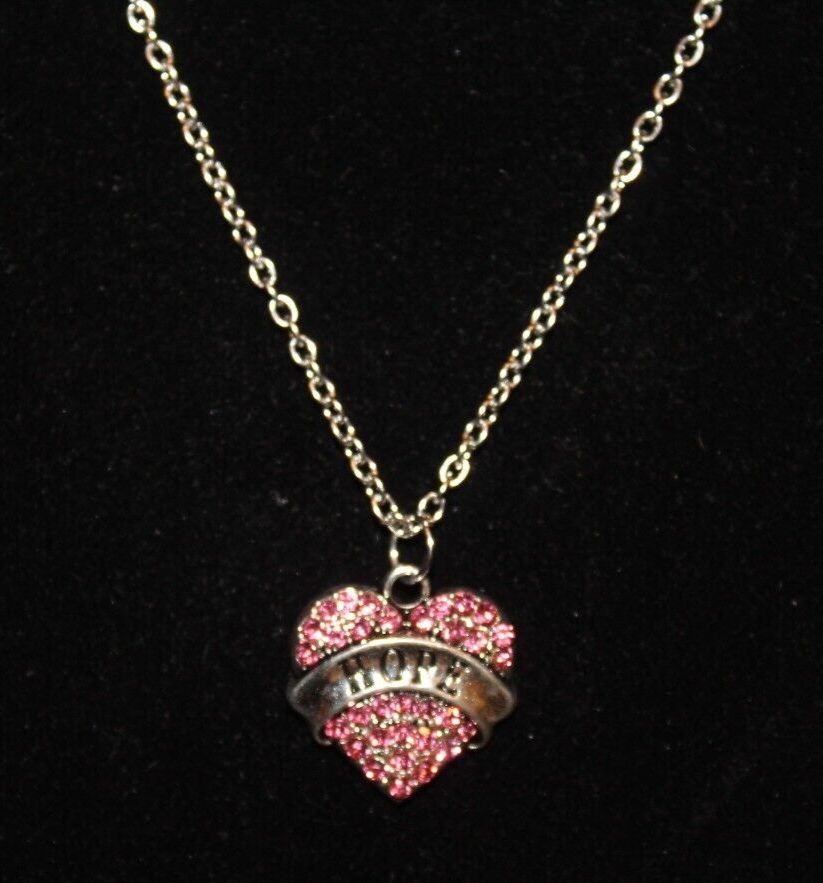 Vintage NOS Silver Pink Rhinestone Heart Breast Cancer Hope Necklace Jewelry