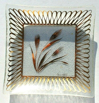 Vintage Large Glass MCM Gold Wheat Thistle Appetizer Plate - Signed