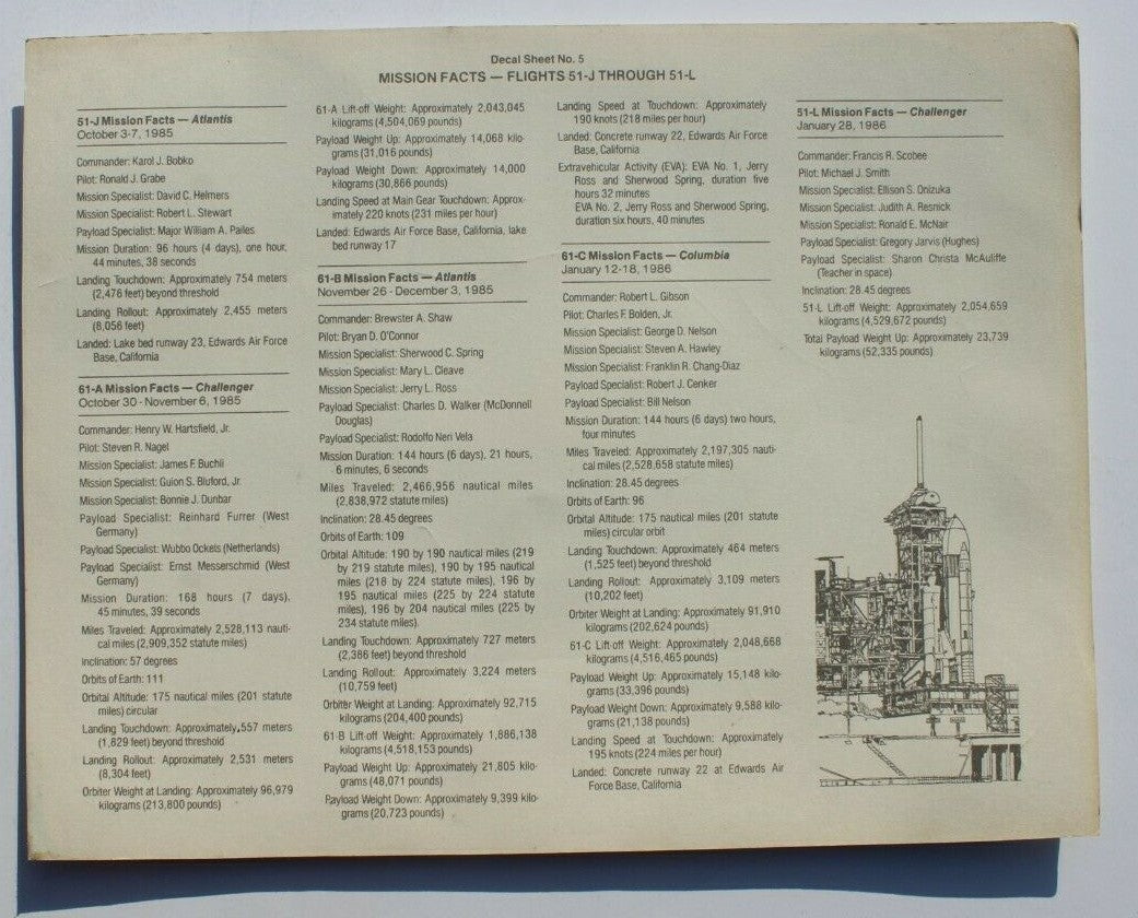 5 Vintage Space Shuttle Decal Sheet No. 5. Flights 51-J through 51-L Stickers