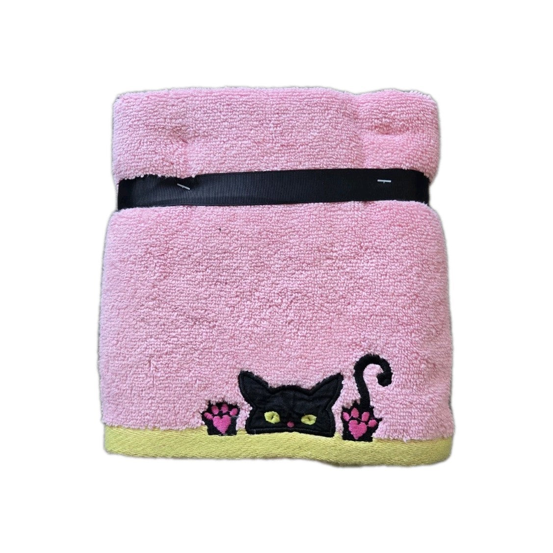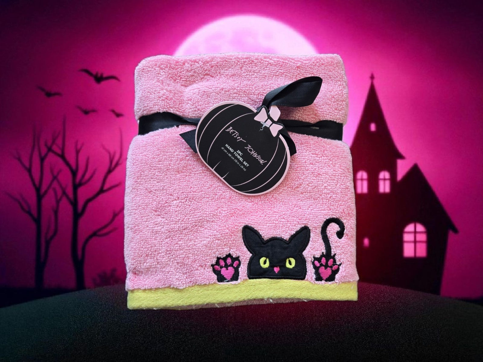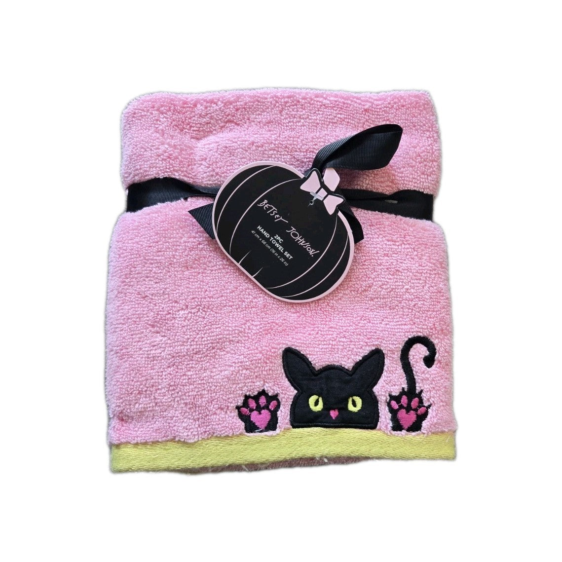 2 Betsey Johnson Pink Halloween Looking Cat Hand Towels 16x26 Cotton Embroidered