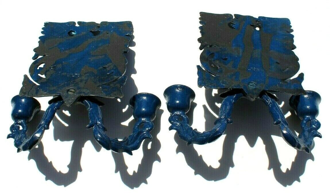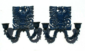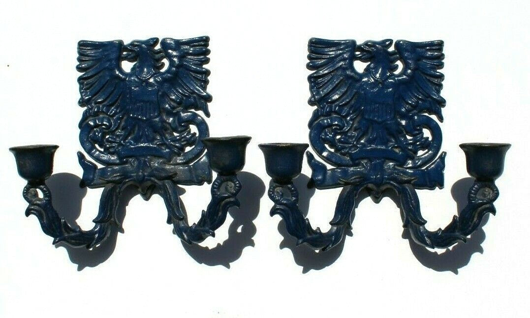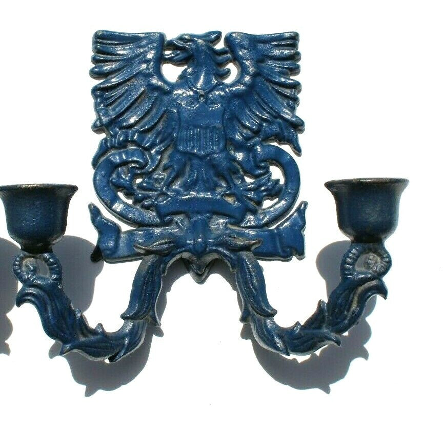 2 Vintage Cast Iron Wilton Blue Eagle Crest Candle Colder Wall Display Set