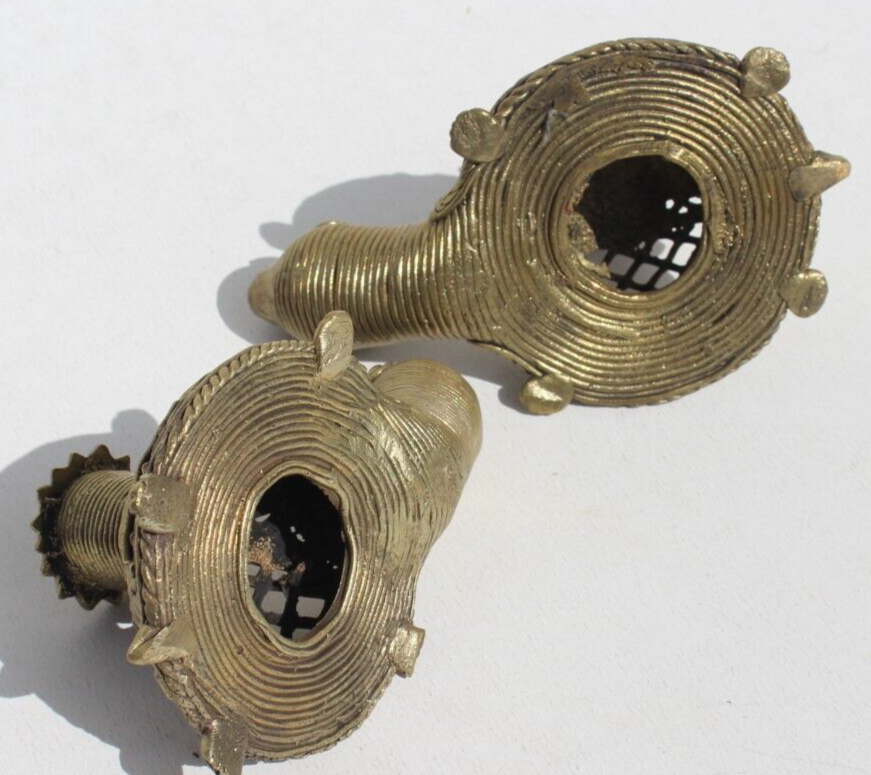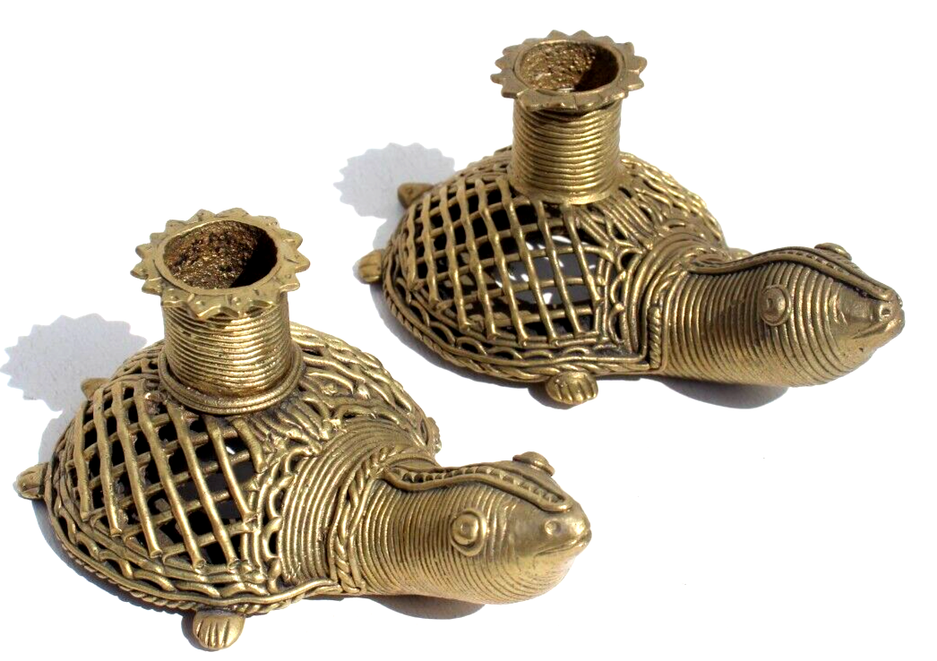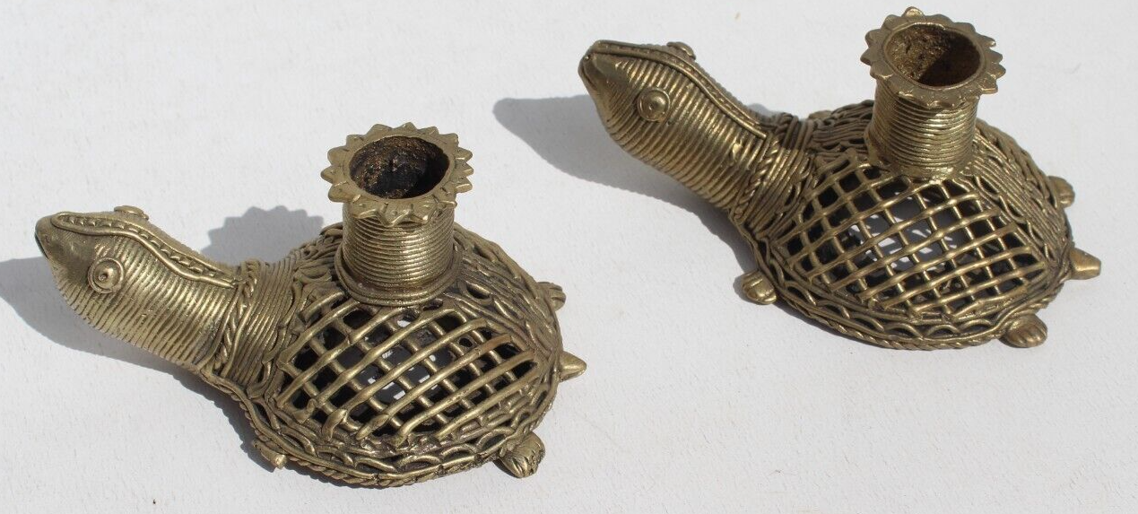 2 VTG Handcrafted Dhokra Metal Art Candle Stand W/ Netted Tortoise Figurine Base
