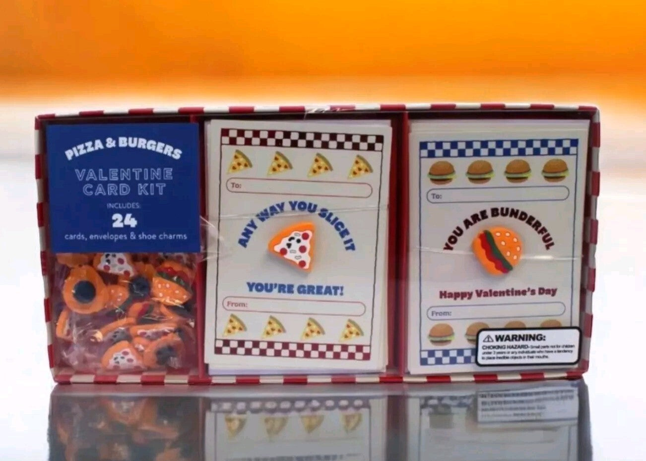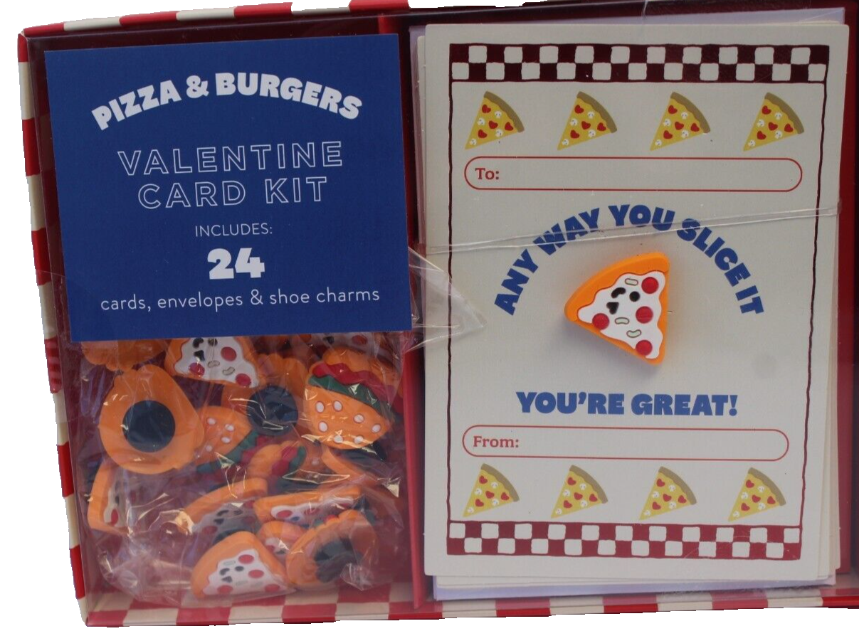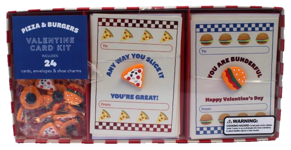 24 Packs Pizza & Burgers Valentine Cards Kids School Classroom W/ Shoe Charms