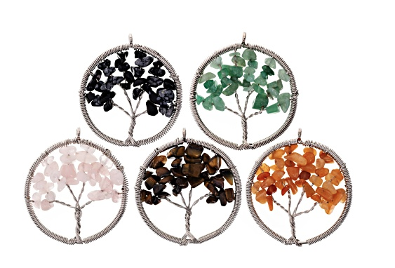 5pc Tree Of Life Chips Pendant Set: Qtz,Aventurine Quartzite, Rose Qtz, Tiger Eye&Snowflake Obsidian
